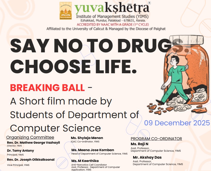 The Department of Computer Science at YIMS took a strong stance against substance abuse with the screening of their student-produced short film, “Breaking Ball,” on December 9th, 2025. Directed by Ashiq Sufail and Abhijith, the film serves as a centerpiece for the department’s “SAY NO TO DRUGS. CHOOSE LIFE” campaign. Under the guidance of Program Co-ordinators Ms. Raji N and Mr. Akshay Das, the project featured a talented student cast and crew dedicated to using digital media for social impact. This initiative highlights the department’s mission to not only develop technical expertise but also to foster socially responsible citizens.