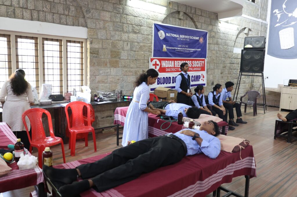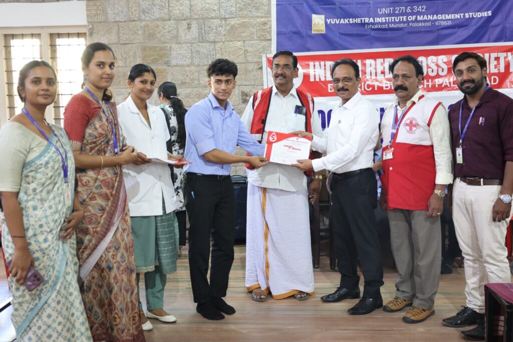 NSS Units 271 and 342 of YIMS in collaboration with Indian Red Cross Society, Palakkad District Branch successfully organized a Blood Donation Camp today at Symphony Hall, HM Block, YIMS from 9:30 am to 2 pm on 19th February 2026. The camp facilitated life-saving contributions from dedicated volunteers, teachers and students. This initiative focused on Rural Service and community welfare through the vital act of blood donation. The programme concluded with the distribution of certificates issued by Indian Red Cross Society and certificates were given by Dr. Tomy Antony, Principal, YIMS to Blood Donors marking a significant achievement for the college’s humanitarian efforts.