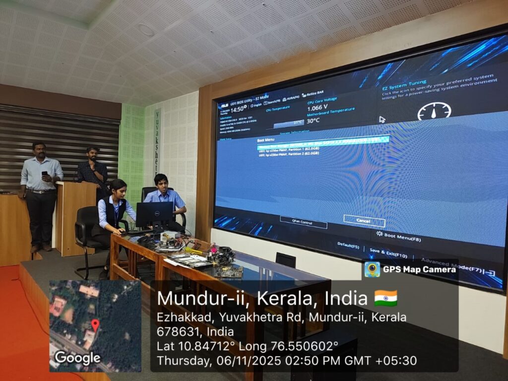 The Department of Computer Applications organized a workshop titled “Mastering the Art of OS Setup” on 6th November 2025 at Sapienza Hall for I BCA A & B students. The session, led by Mr. Gireesh T and Mr. Sujith P V, System Administrators at YIMS, provided students with practical insights into computer hardware components and hands-on experience in installing and configuring operating systems.