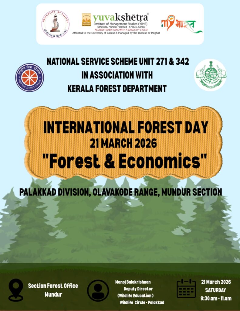 In observance of International Forest Day, NSS Units 271 and 342 of YIMS, Mundur in association with Mundur Section Forest Office, Kerala Forest Department organized an awareness session led by Deputy Director Manoj Balakrishnan, Wildlife Education, Wildlife Circle, Palakkad on 21st March 2026 at Section Forest Office, Mundur. The session focused on the theme “Forest & Economics” and this initiative aimed to bridge the gap between ecological conservation and sustainable financial development. The programme was inaugurated by Krishna Das K R, Range Forest Officer, Olavakode Range. Rev. Dr. Joseph Olikkalkoonal presided over the programme. NSS Programme Officers Mr. Midhun M and Ms. Hema S offered felicitations. Participants took a formal Oath highlighting the critical importance of forests in maintaining environmental stability and providing the essential resources necessary for the survival and prosperity of future generation.