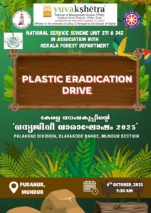 NSS Units 271 & 342 of YIMS in association with the Kerala Forest Department, held a “Plastic Eradication Drive” on 4th October 2025. The drive was conducted at Pudanur, Mundur, organized by the Palakkad Division, Olavakode Range, Mundur Section as part of the “Wildlife Week Celebration.” NSS Volunteers participated in the event contributing to the cleanliness efforts of the Forest Division.